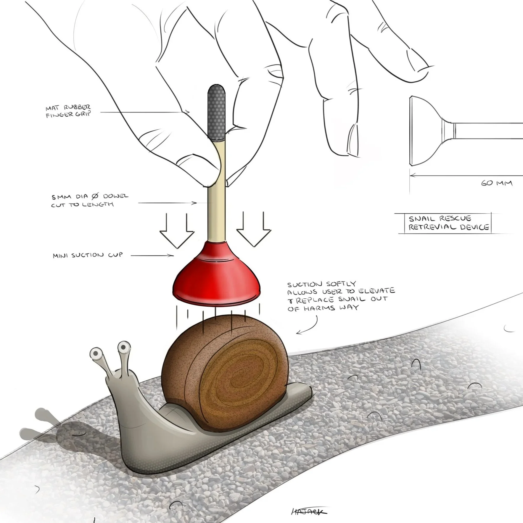 "A mini plunger to safely relocate vulnerable snails from the sidewalk"